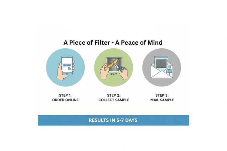 1. Order online. 2. Cut 3"X3" piece of your air filter 3. Mail it in a baggie and envelope.